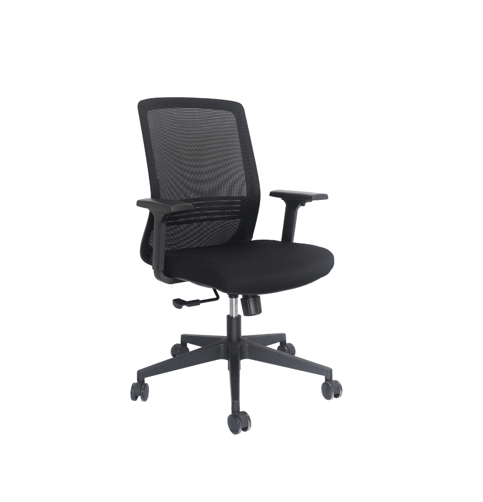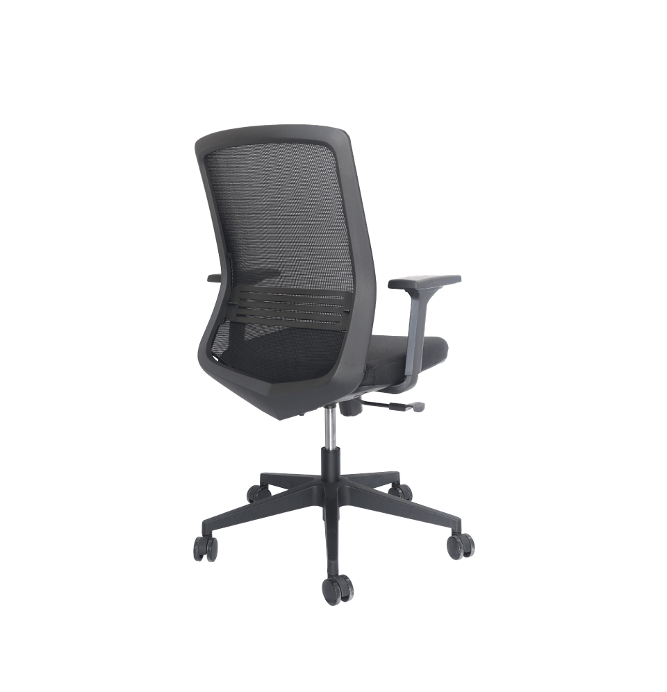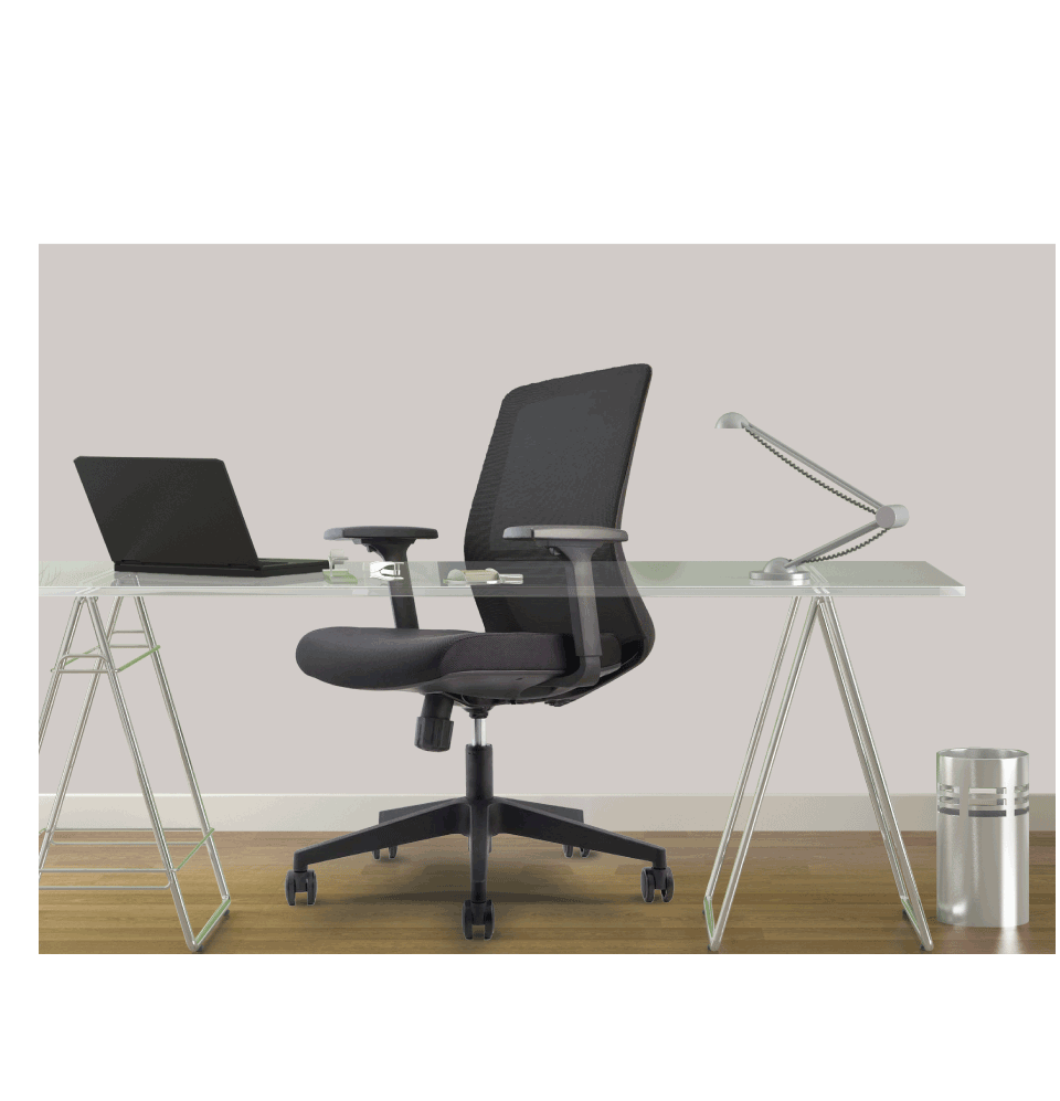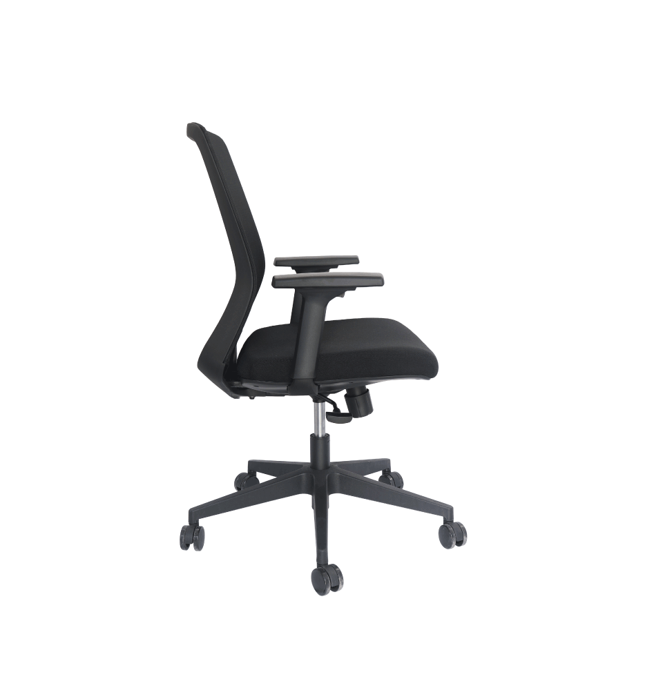 Silla semi ejecutiva con base estrella de 5 puntas en nylon reforzado, rodajas tipo dual y/o regatones. Elevación por medio de pistón neumático que permite ajustar la altura del asiento. Brazos ajustables de polipropileno semi-rígido con 7 posiciones, con respaldo en malla de diseño ergonómico, asiento de hule espuma de poliuretano inyectado flexible con densidad de 60 kgs/m3 con retardante a la flama y alta resistencia