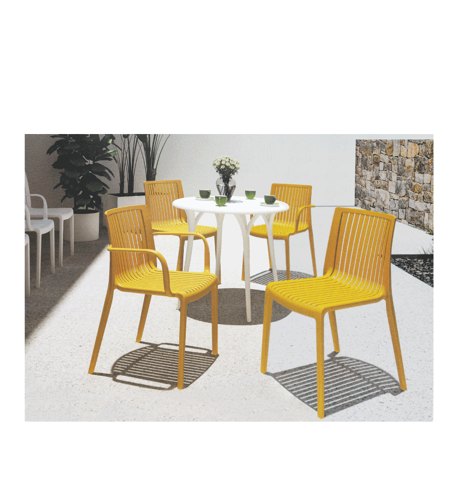 patas, asiento y respaldo: de una sola pieza en polipropileno de alta resistencia y duración para intemperie, resistente a los rayos ultravioleta (UV) y al ambiente salino.