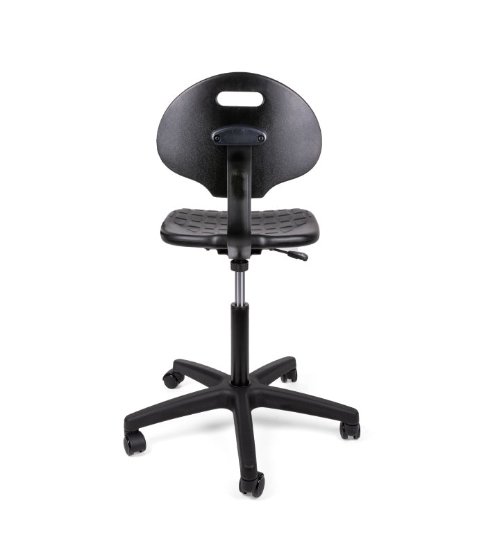 respaldo y asiento: poliuretano compacto suave de uso industrial con interior en madera de aglomerado, asiento con curvatura antropométrica.