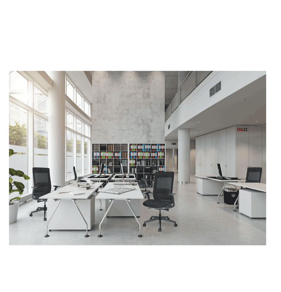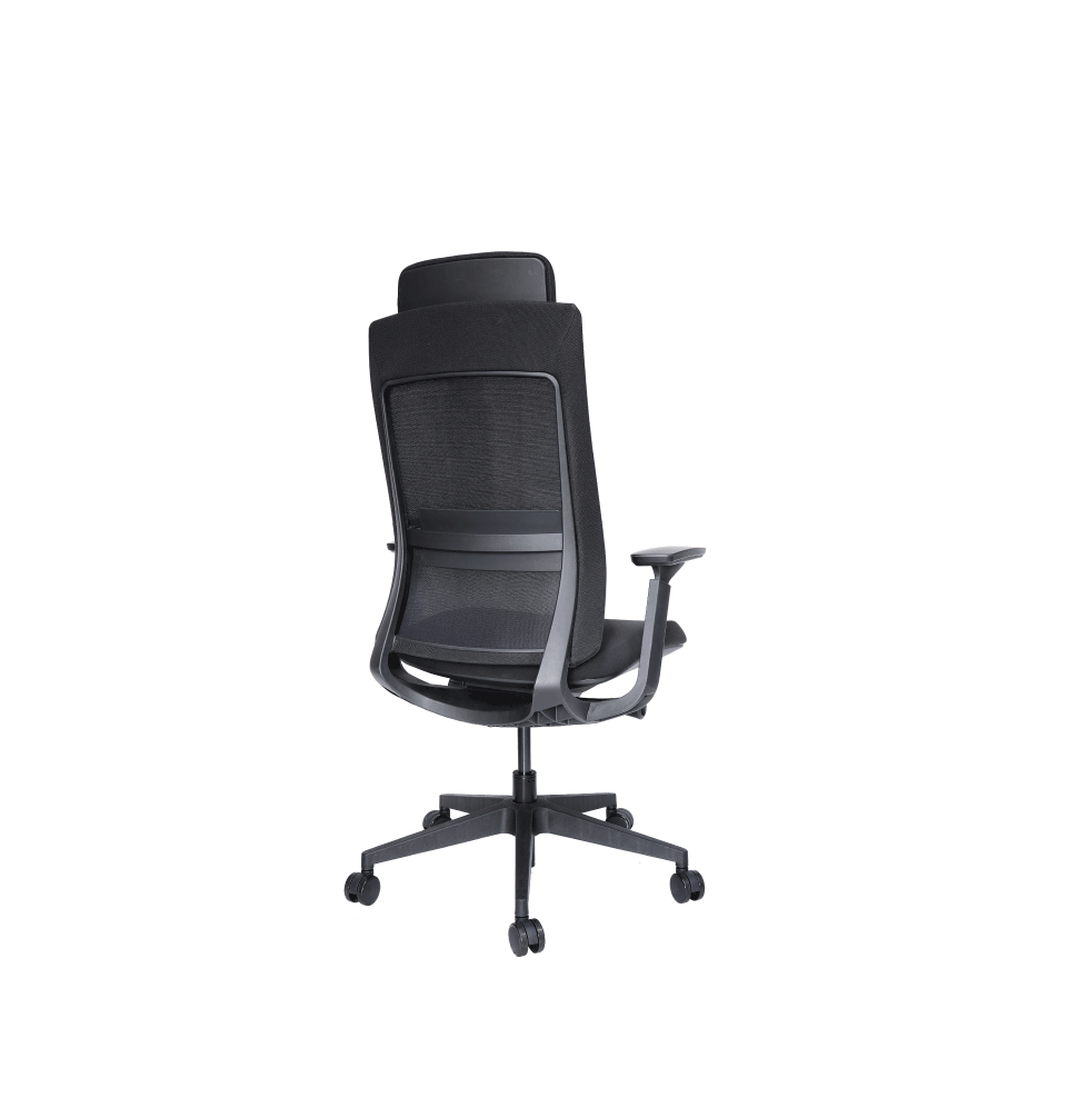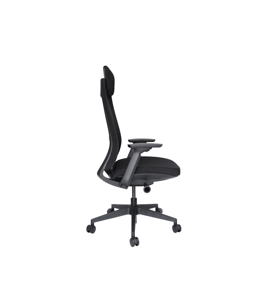 Silla ejecutiva con respaldo en malla de diseño ergonómico con cabecera, asiento de hule espuma de poliuretano inyectado flexible con densidad de 60 kgs/m³ con retardante a la flama y alta resilencia. Brazos tipo 3D giratorios y ajustables de altura en poliuretano semi-rígido y suave. Base de estrella de 5 puntas en nylon reforzado, rodajas tipo dual y/o regatones.