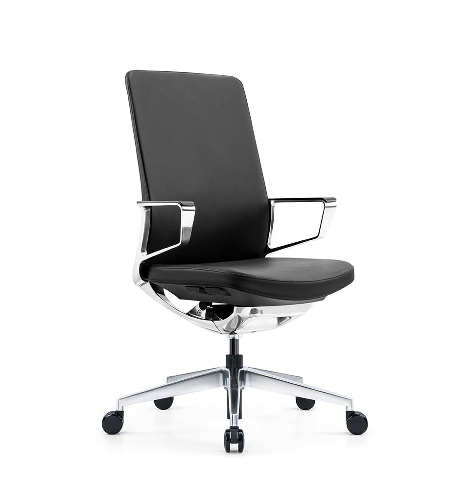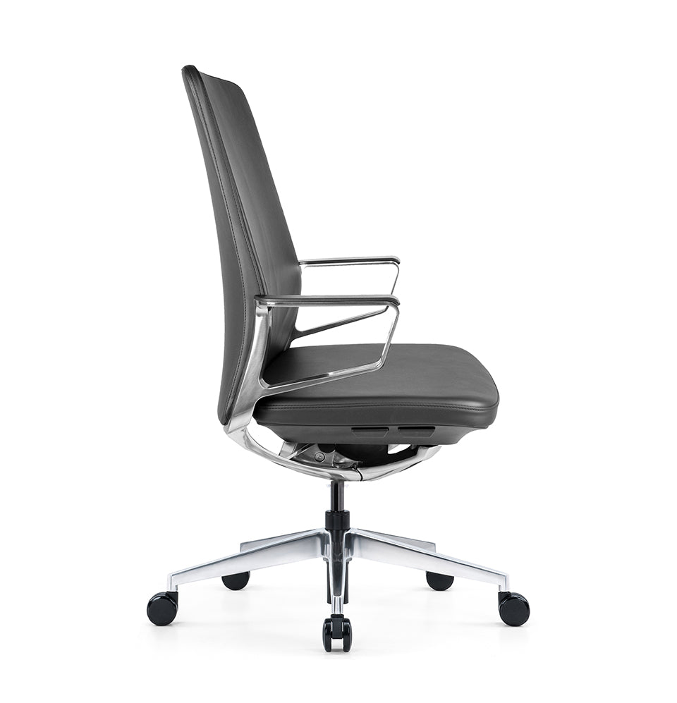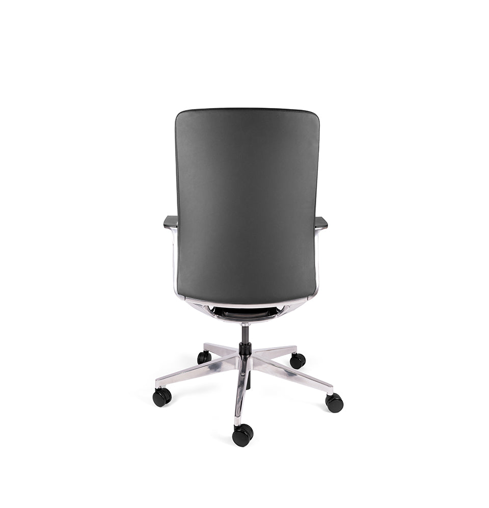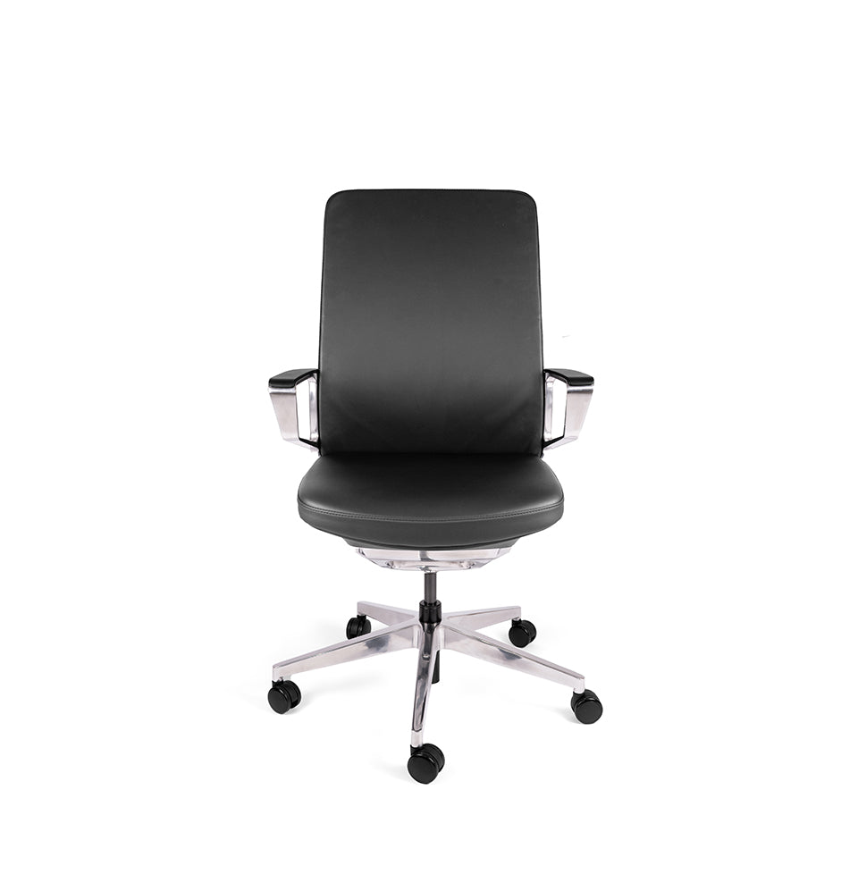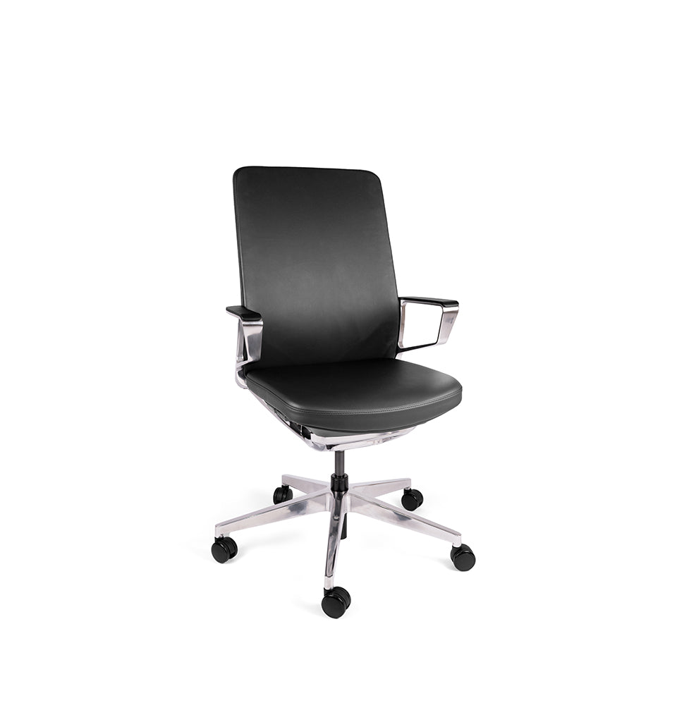 BASE Estrella pentagonal de 5 puntas y diámetro de 600 mm (26*) nervada. Límite de carga de 830-860 kgs Rodajas y/o regatones intercambiables. Material en aluminio fundido. Color aluminio pulido. RODAJAS Doble de 60 mm de diámetro. Limite de carga 172 kgs. Nylon 100%, nervada y concha protectora. Perno eje de acero. Perno pivote de acero en diámetro 7/16" y 7/8" en longitud, para ensamble a presión. Giro de 360 Vida útil de 250,000 ciclos continuos. Color negro. SISTEMA DE ELEVACIÓN Pistón neumático de gas nitrógeno a presión con fuerza de levante de 350 N con 2 cámaras (1 de compresión y 1 de chicompresión) con inauen de so, con toscot re uso continuo. Ensamble cónico a presión en la base del asiento y en la base de la silla. Cubierta cilíndrica de acero. Balero de bolas para giro 360º. No se instala ningún tipo de cubierta protectora. MECANISMO Synchro inteligente con anti-shock. La base del mecanismo así como los brazos forman una sola pieza articulada en tres secciones de aluminio fundido y pulido. Botones de activación ocultos en la concha del asiento: 1. Activación de pistón. 2. Accionamiento del slider en diferentes posiciones. 3. Reclinamiento de respaldo con bloqueo. Regulador de tensión de la inclinación, fornillo con ajuste por medio de llave allen. BRAZOS Fios en fundición de aluminio color aluminio pulido con pad color negro de poliuretano inyectado adheridos a la estructura. CARACTERÍSTICAS Diseño ergonómico. Respaldo medio. RESPALDO Bastidor de poliuretano de alta densidad Soportes en forma de "L" ensamblados al bastidor por un extremo y por el otro se fijan con el asiento en material de fundición de aluminio color negro matealuminio pulido. ASIENTO lapa protectora en polipropileno virgen de alta densidad Asiento interior en madera triplay preformado compuesto por diversas hojas con un espesor de 12mm. Acojinado con hule espuma de poliuretano inyectado y dimensiona da en 50 mm de espesor, de alta densidad (60 kgs/m') y de alta resilencia, con retardante a la flama. TAPIZ Piel genuina italiana color negro mate. RESISTENCIA Peso máximo de resistencia 180 kgs.