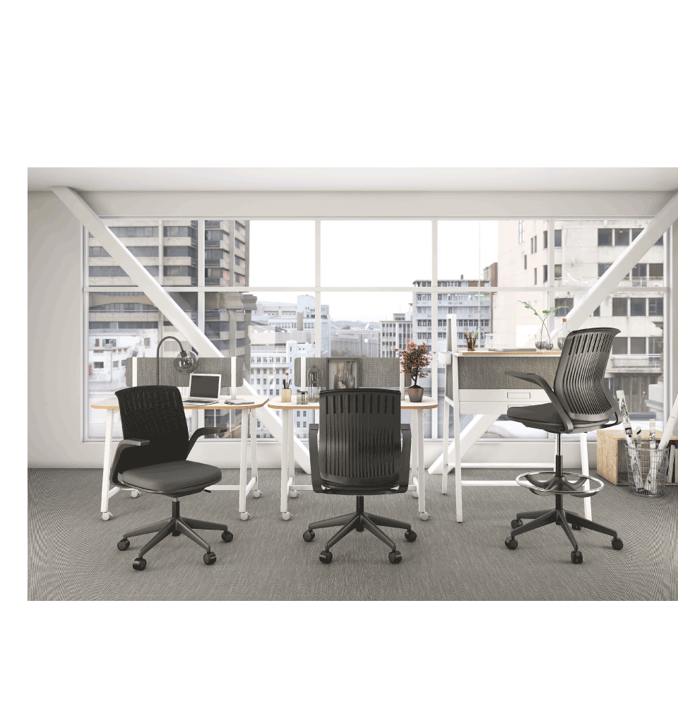 Silla semi ejecutiva de oficina con respaldo de bastidor en polipropileno de alta resistencia y duración, asiento de hule espuma laminado flexible con densidad de 30 kgs/m³ y alta resilencia, brazos de polipropileno semi-rígido.